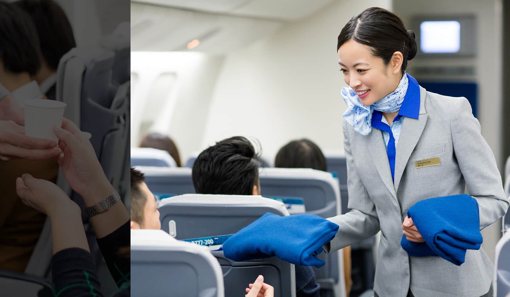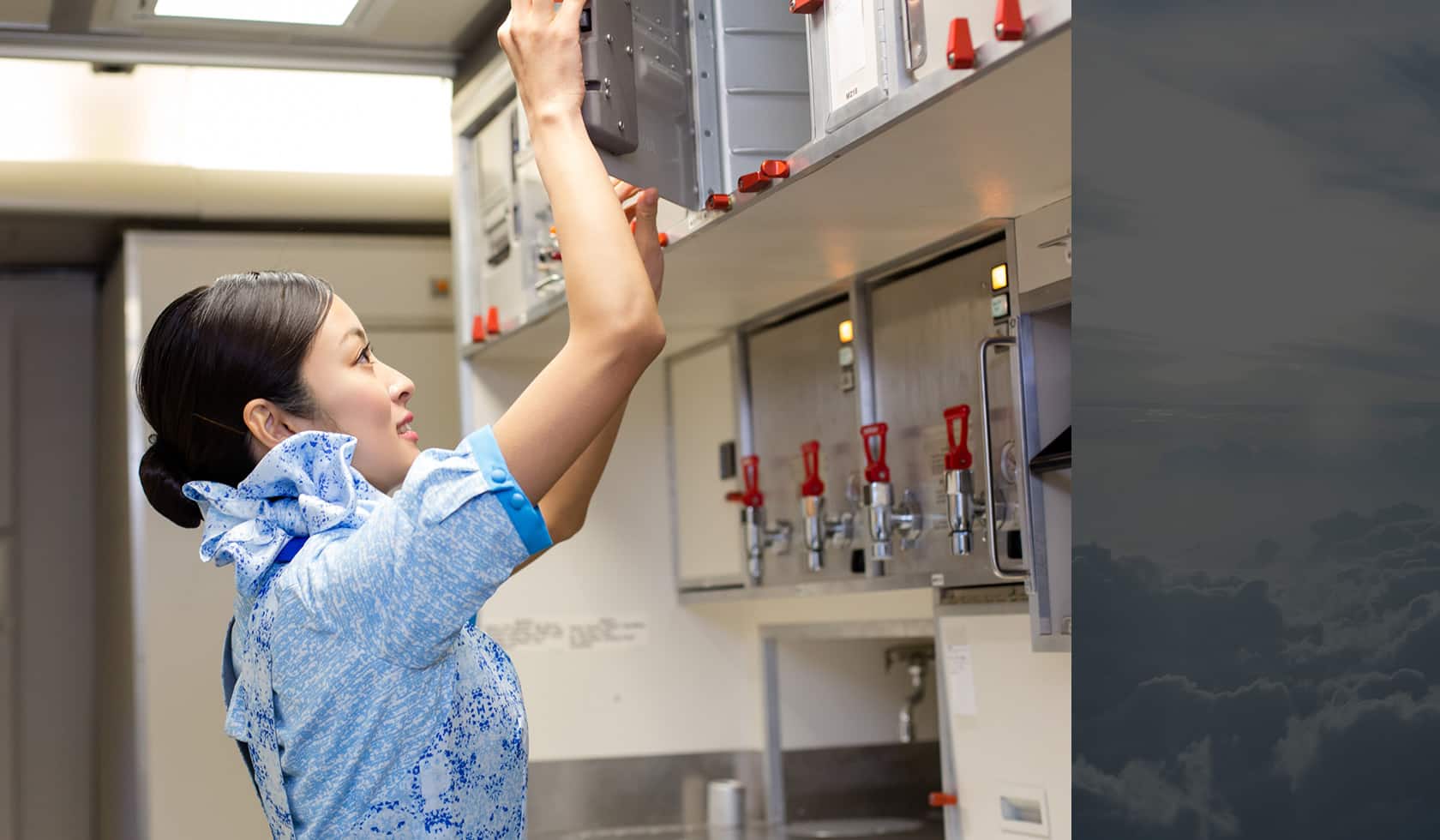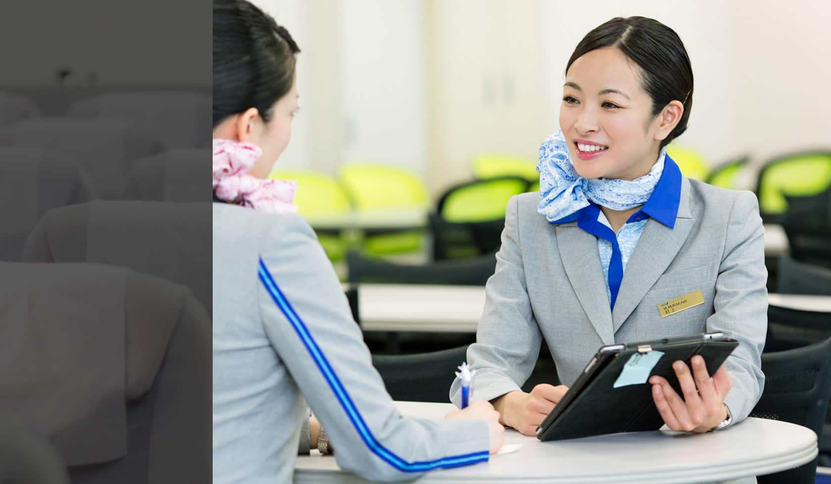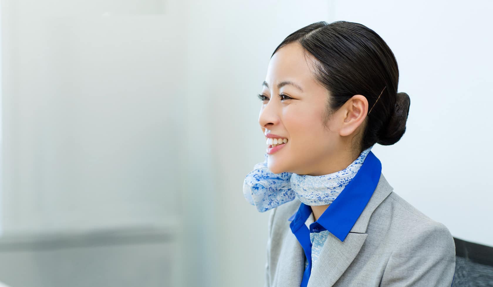 苦労も笑顔で乗り越える。 目指すはファーストクラス 村上は明るくにこやかだ。そして周囲に対してのみならず、仕事に対しても至って真摯に向き合っている。「お客様の立場に立って、ものごとを考えるように心がけています。たとえばサービスに規定がなかったとしても、お客様が現在置かれている状況を察して、なにかできることはないか、常に考えるようにしています」また自身のキャリアに対しても前向きで、仕事の幅を国際線にも広げている。「2年半くらい前からです。最初のうちはとまどいました。時差もあるので、慣れないうちはぐったりすることも多かったですね。長いフライトでは途中休憩があるのですが、最初のうちは休めませんでした」客室乗務員という夢を叶え、さらに英語も使いこなす仕事ができている。加えて、制服のデザインに関わることもできた。だが、そこで満足しない。「次はファーストクラスを目指したいです。サービスの幅が広がることで、自分自身の視野も広げられるのではと思っています。ただ、ファーストクラスを担当するには、マナーのみならず、時事問題にも精通しておく必要があるんです」