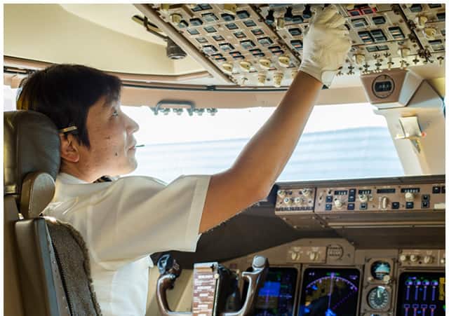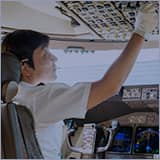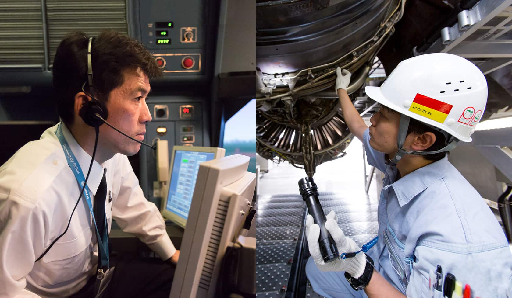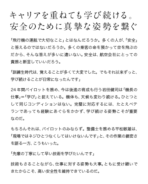 キャリアを重ねても学び続ける。安全のために真摯な姿勢を繋ぐ 「飛行機の運航で大切なこと」とはなんだろうか。多くの人が、「安全」と答えるのではないだろうか。多くの乗客の命を預かって空を飛ぶのだから、そんな答えが多いに違いない。安全は、航空会社にとっての責務と断言していいだろう。「訓練生時代は、覚えることが多くて大変でした。でもそれ以来ずっと、学び続けることが日常になったんです」24年間パイロットを務め、今は後進の育成も行う岩田健司は「機長の仕事」=「学び」と捉えている。機体も、天候も変わり続ける。ひとつとして同じコンディションはない。完璧に対応するには、たとえベテランであっても経験にあぐらをかかず、学び続ける姿勢こそが重要なのだ。もちろんそれは、パイロットのみならず。整備士を務める平松敏雄は、「現場ではネジひとつなくしてはいけないんです」と、その作業の緻密さを語る一方、こうもいった。「先輩の丁寧にして早い技術を学びたいんです」技術もさることながら、仕事に対する姿勢も大事。ともに受け継いできたからこそ、高い安全性を維持できているのだ。