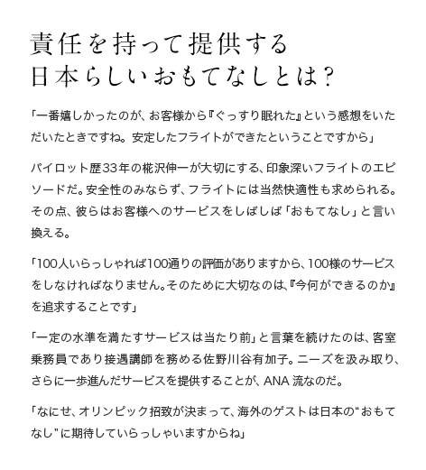 責任を持って提供する日本らしいおもてなしとは? 「一番嬉しかったのが、お客様から『ぐっすり眠れた』という感想をいただいたときですね。安定したフライトができたということですから」パイロット歴33年の椛沢伸一が大切にする、印象深いフライトのエピソードだ。安全性のみならず、フライトには当然快適性も求められる。その点、彼らはお客様へのサービスをしばしば「おもてなし」と言い換える。「100人いらっしゃれば100通りの評価がありますから、100様のサービスをしなければなりません。そのために大切なのは、『今何ができるのか』を追求することです」「一定の水準を満たすサービスは当たり前」と言葉を続けたのは、客室乗務員であり接遇講師を務める佐野川谷有加子。ニーズを汲み取り、さらに一歩進んだサービスを提供することが、ANA流なのだ。「なにせ、オリンピック招致が決まって、海外のゲストは日本の“おもてなし”に期待していらっしゃいますからね」