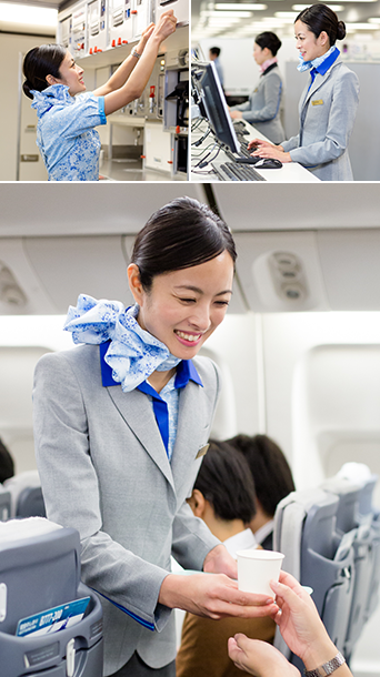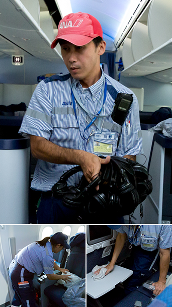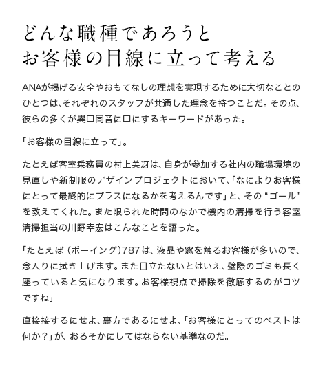 どんな職種であろうとお客様の目線に立って考える ANAが掲げる安全やおもてなしの理想を実現するために大切なことのひとつは、それぞれのスタッフが共通した理念を持つことだ。その点、彼らの多くが異口同音に口にするキーワードがあった。「お客様の目線に立って」。たとえば客室乗務員の村上美冴は、自身が参加する社内の職場環境の見直しや新制服のデザインプロジェクトにおいて、「なによりお客様にとって最終的にプラスになるかを考えるんです」と、その“ゴール”を教えてくれた。また限られた時間のなかで機内の清掃を行う客室清掃担当の川野幸宏はこんなことを語った。「たとえば(ボーイング)787は、液晶や窓を触るお客様が多いので、念入りに拭き上げます。また目立たないとはいえ、壁際のゴミも長く座っていると気になります。お客様視点で掃除を徹底するのがコツですね」直接接するにせよ、裏方であるにせよ、「お客様にとってのベストは何か?」が、おろそかにしてはならない基準なのだ。