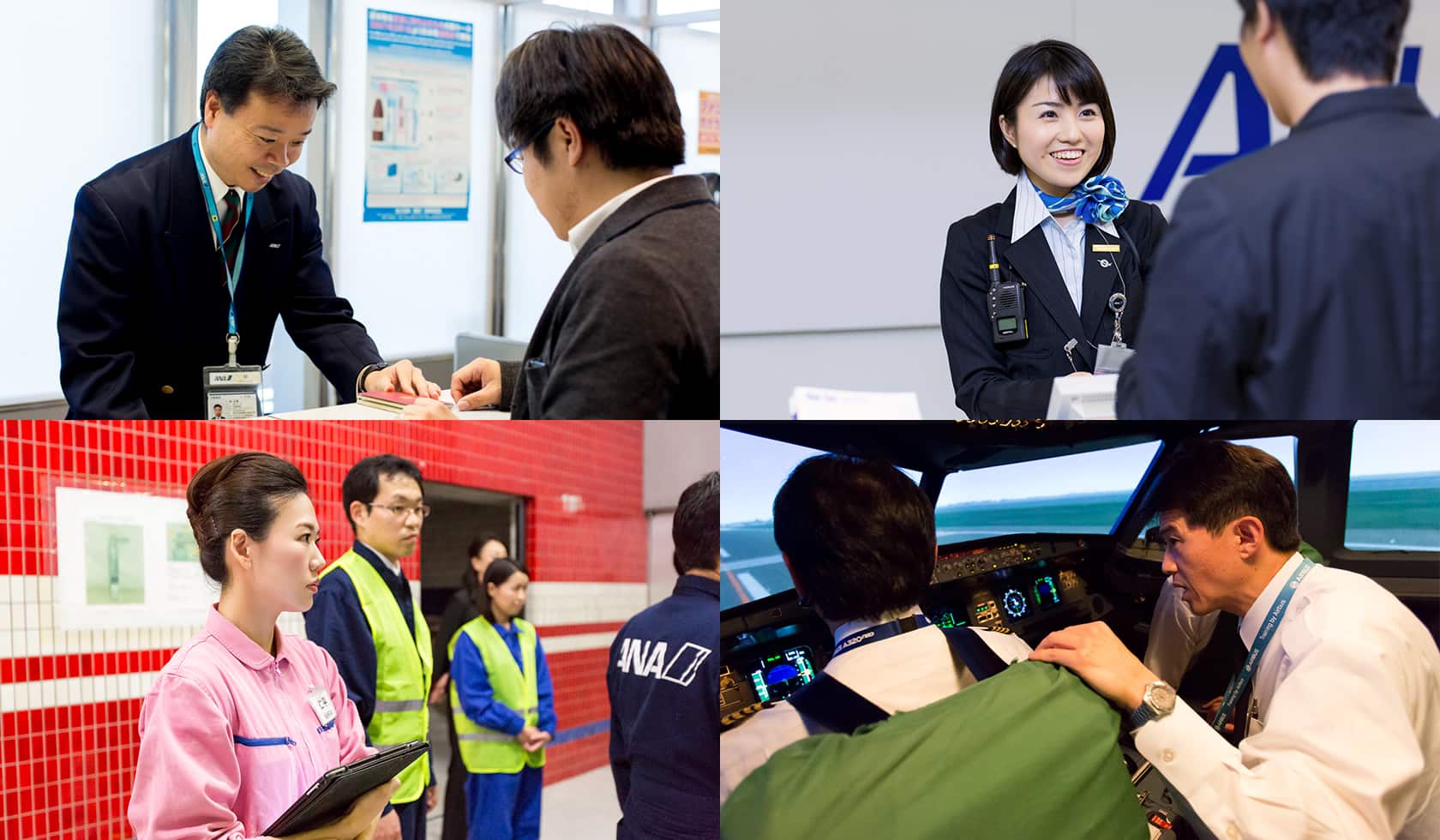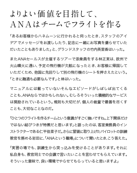 よりよい価値を目指して、ANAはチームでフライトを作る 「あるお客様からハネムーンに行かれると伺ったとき、スタッフのアイデアでメッセージをお渡ししたり、記念に一緒にお写真を撮らせていただいたこともありました」と、グランドスタッフの竹内英里香はいった。またANAセールスが主催するツアーで添乗員をする林正実は、欧州で火山噴火に遇い、予定の飛行機が欠航になったとき、お客様に帰国していただくため、他国に先回りして別の飛行機のシートを押さえたという。「ときに融通も必要なんです」と林はいった。マニュアルには載っていないそんなエピソードがしばしば出てくることも、ANAならではかもしれない。むしろそういった積極的なサービスは奨励されているという。規則も大切だが、個人の裁量で最善を尽くすことも、大切なことなのだ。「ひとつのフライトを作るチームという意識がすごく強いですね。上下関係だけではない結びつきが特徴だと思います」と語ったのは、客室乗務員のインストラクターである仁平佳菜子だ。さらに冒頭に取り上げたパイロットの訓練教官を務める岩田に、「ANAという職場」について聞いたとき、こう答えた。「実習の場でも、訓練生から突っ込みを受けることがあります。それに私自身も、教官同士での会議で言いたいことを言わせてもらえています。そういった意味で、良い環境でやらせてもらっていると思いますよ」