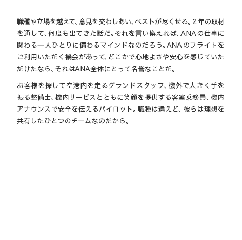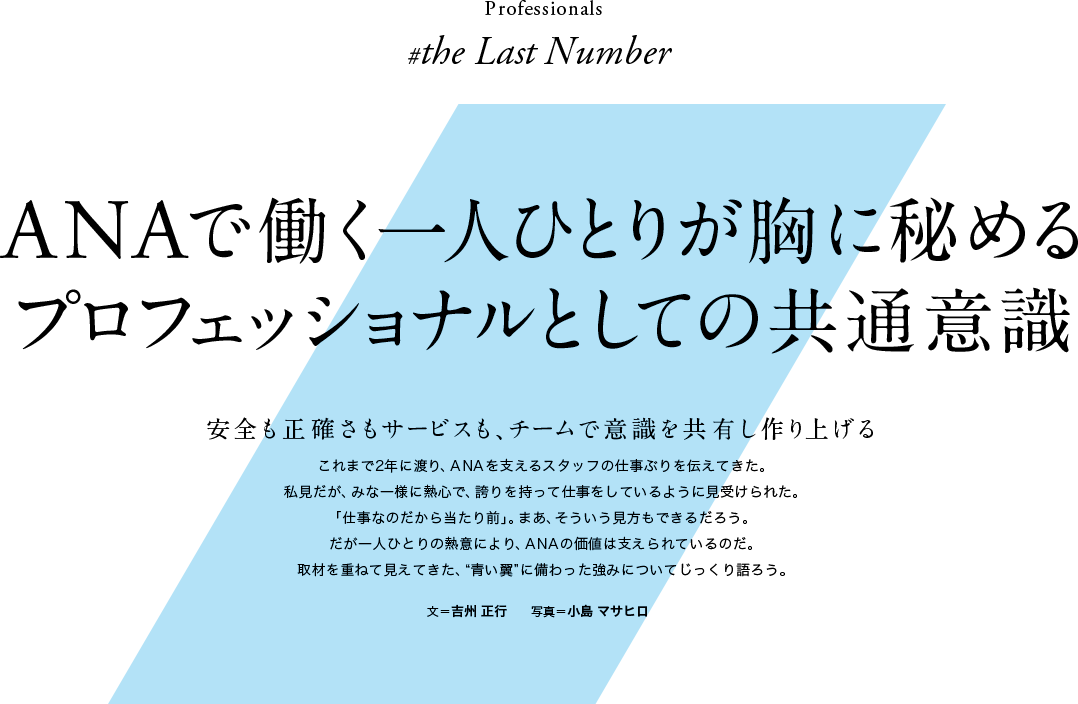 Professionals #the Last Number ANAで働く一人ひとりが胸に秘めるプロフェッショナルとしての共通意識 安全も正確さもサービスも、チームで意識を共有し作り上げる これまで2年に渡り、ANAを支えるスタッフの仕事ぶりを伝えてきた。私見だが、みな一様に熱心で、誇りを持って仕事をしているように見受けられた。「仕事なのだから当たり前」。まあ、そういう見方もできるだろう。だが一人ひとりの熱意により、ANAの価値は支えられているのだ。取材を重ねて見えてきた、“青い翼”に備わった強みについてじっくり語ろう。文=吉州 正行  写真=小島 マサヒロ