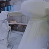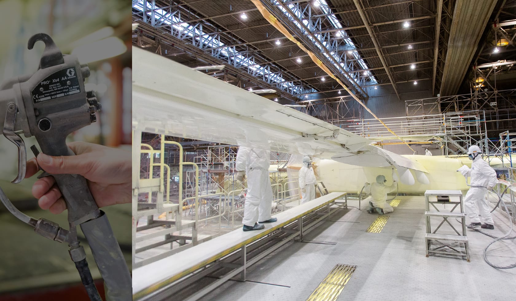 美しい機体をお客様に届けることで、安心感を感じてもらう 大阪、伊丹空港に面した巨大ドック内に鎮座しているのは、「ボンバルディアDHC8-Q400」。旅客機の中では小型の部類に入るプロペラ機とはいえ、間近で見るとその大きさに圧倒される。そして驚くのは、ビニールでマスキングされ、完全に無地であるということ。「定期整備の一環として、今回は古い塗装の表面を削り、平滑にしてから新しい塗装を重ねるオーバーコートです。しかし、部分的に古い塗装を落とし、アルミスキンにしたあと新しい塗装を施すリペイントもしています」この道24年のベテランである森本保行は語る。手順はこうだ。ペイントを専門の薬品で剥離、その後、腐食点検・除去など行い、外板の継ぎ目を塞ぐシーリングを施す。さらに機体のクリーニングを行い防錆塗料を塗る。そしてようやく今からANAカラーを塗る作業に入るという。「作業性、効率性がよい静電塗装機で塗料を吹き付けます。塗装の厚さは重要なファクターになり、厚く塗れば機体の重量に影響し、薄ければ本来の塗装の役目が早期に失われるため、細心の注意を払って作業しています」一度に塗り分けるのではなく、スプレーしたらマスキングを施し、順に重ねて塗る作業だという。 「特に注意しているのは、冬場と夏場、温度や湿度の高低で条件はかなり変わってきますので、技量はもちろん、経験やノウハウがものを言います。塗料の粘度や乾燥促進剤の比率を変えるなど、気を遣うところは多いですよ」