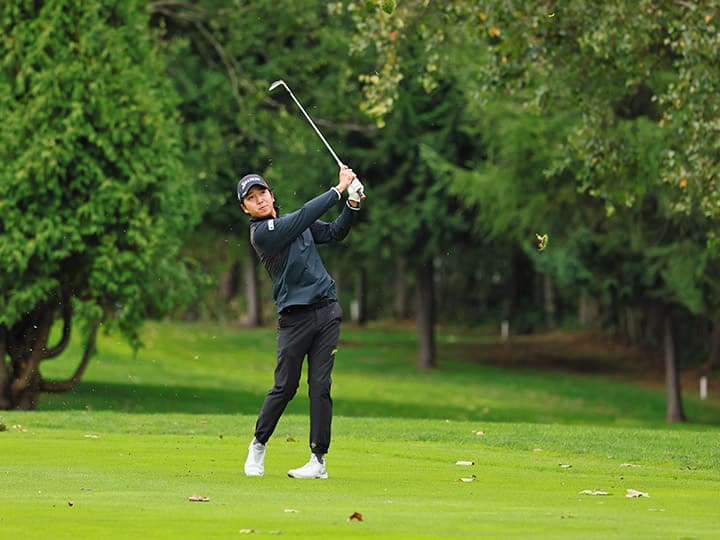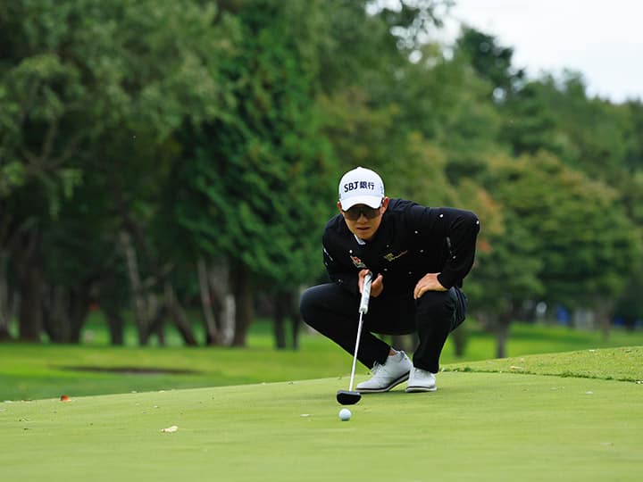 この日、大槻選手は3番ホールをボギーとし、5番のロングホールで1つ取り返すも続く7番ホールでボギー。思うようにスコアを伸ばすことができずに前半を終えます。単独2位でスタートした金谷選手は2番ホールをダブルボギーとして出遅れましたが、その後3番から4連続バーディー、一時首位に並びます。しかし、8番ホールでこの日2つ目となる痛恨のダブルボギー。9番ホールで1つ取り返し、大槻選手と同じ15アンダーで後半へ進みます。