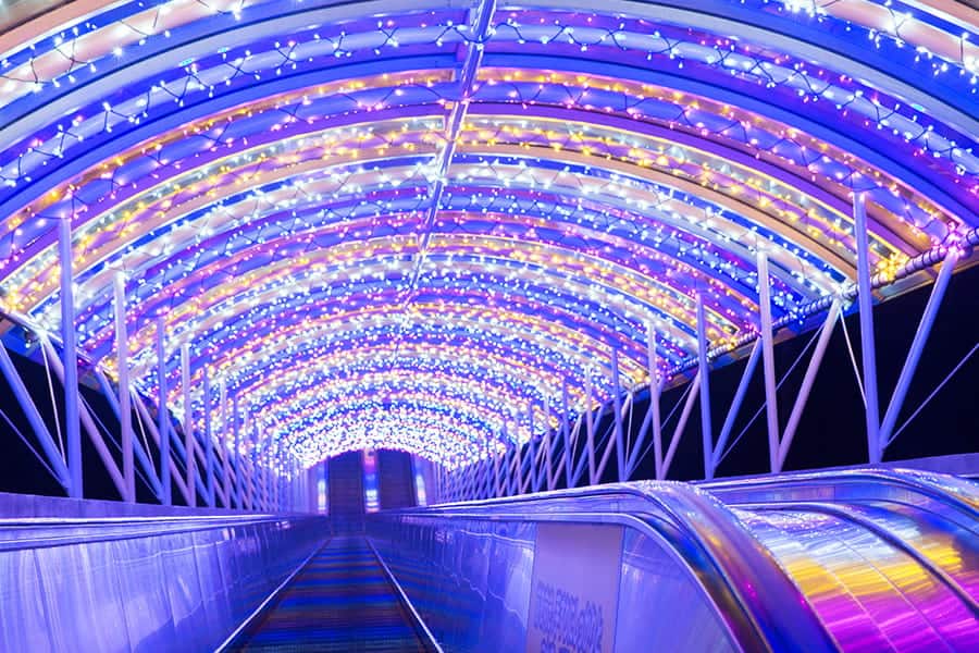 Verpassen Sie nicht die Chance, mit der längsten Rolltreppe in Japan zu fahren. New Reoma Worlds Magic Straw ist 42 Meter hoch und 96 Meter lang und dauert über 3 Minuten! Und bei Nacht unter glitzernder Beleuchtung ist das Erlebnis noch beeindruckender.