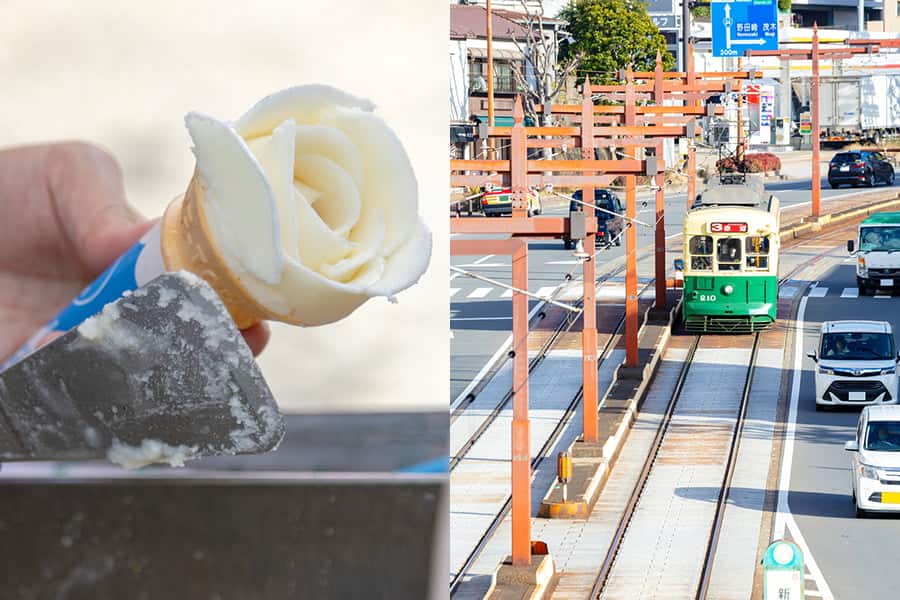 Mit einem Tagesticket für die ikonische „Chin-Chin-Densha“-Tram in Nagasaki fahren Sie an den wichtigsten Sehenswürdigkeiten entlang. Dann hören Sie aus der Ferne den „Chirin-Chirin-Eiswagen“ bimmeln und können sich mit einer Portion Speiseeis abkühlen, einer seit 1960 bestehenden Tradition aus Nagasaki.