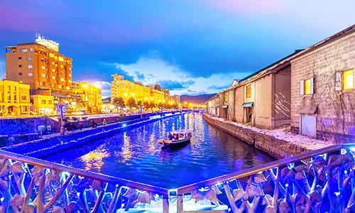 Wenn es dunkel wird, erstrahlen entlang des Kanals 63 Gaslampen und die Lagerhäuser werden beleuchtet, was für eine bezaubernde Abendstimmung sorgt. Im Winter finden auch verschiedene Lichtveranstaltungen statt. Unter dem Motto „Blue Channel“ wird das Wasser des Kanals beispielsweise in ein hinreißendes blaues Licht getaucht, und im Rahmen des „Otaru Snow Light Path“ schmücken Kerzen mit ihrem sanften Licht die Ufer des Kanals. Sie können den bezaubernden Anblick von den Brücken und Wegen aus bewundern oder eine Bootsfahrt buchen, um das Schauspiel aus einer ganz besonderen Perspektive zu erleben.