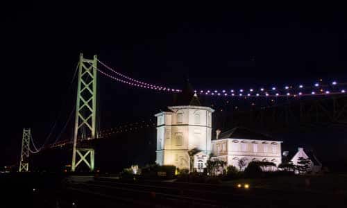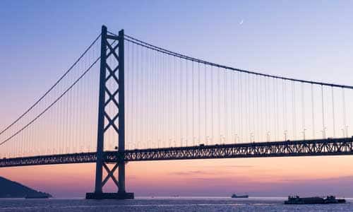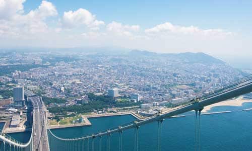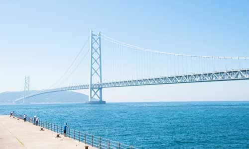 Die Akashi-Kaikyo-Brücke ist die längste Hängebrücke der Welt und verbindet die Stadt Kobe in der Präfektur Hyogo mit der Insel Awaji auf einer Strecke von etwa 4 Kilometern. Erkennbar an den symbolischen zwei in den Himmel ragenden Haupttürmen, ist die Brücke auch als Perlenbrücke bekannt, die nachts wie ein Perlenband wunderschön beleuchtet ist.