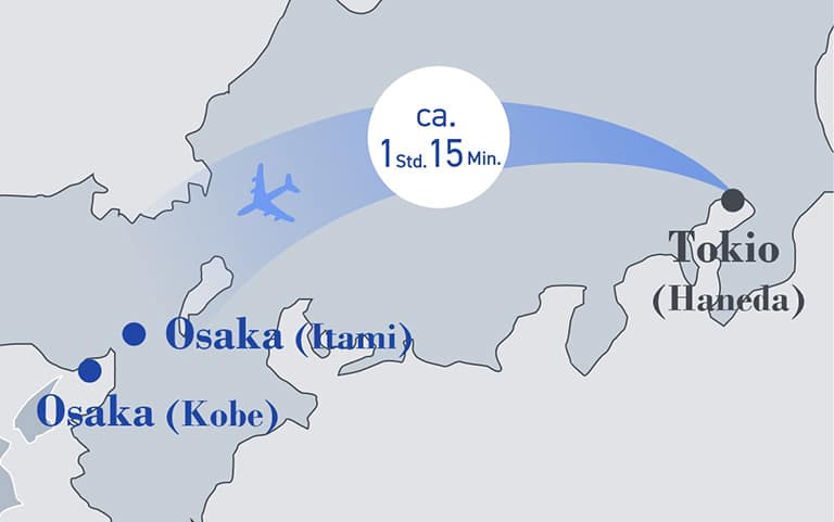 Vom Flughafen Haneda aus können Sie mit dem Flugzeug zum Flughafen Kobe oder zum internationalen Flughafen Osaka (Flughafen Itami) reisen, um von dort bequem ins Stadtzentrum von Kobe zu reisen. Der Flug vom Flughafen Haneda zum Flughafen Kobe oder zum internationalen Flughafen Osaka dauert ca. 1 Stunde und 15 Minuten.