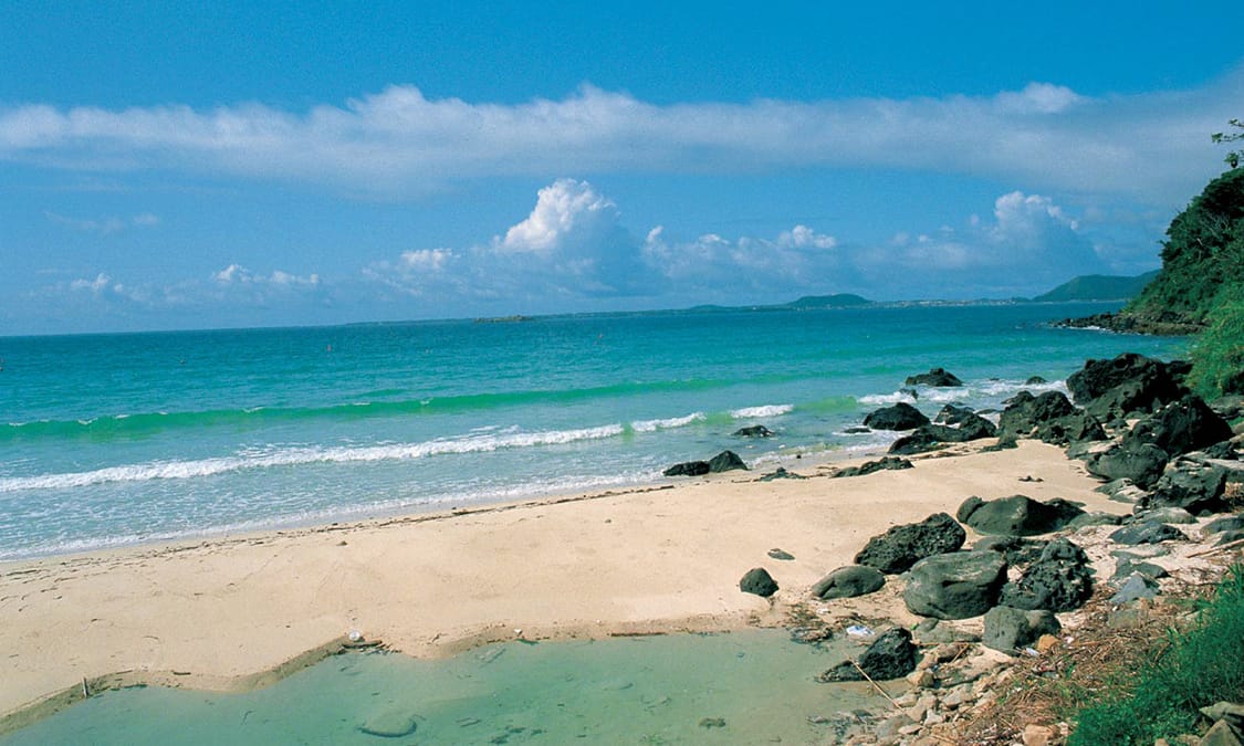 Der weiße Sandstrand von Kojushi lädt zum Schwimmen und dem Genuss von Nagashi-Somen ein.