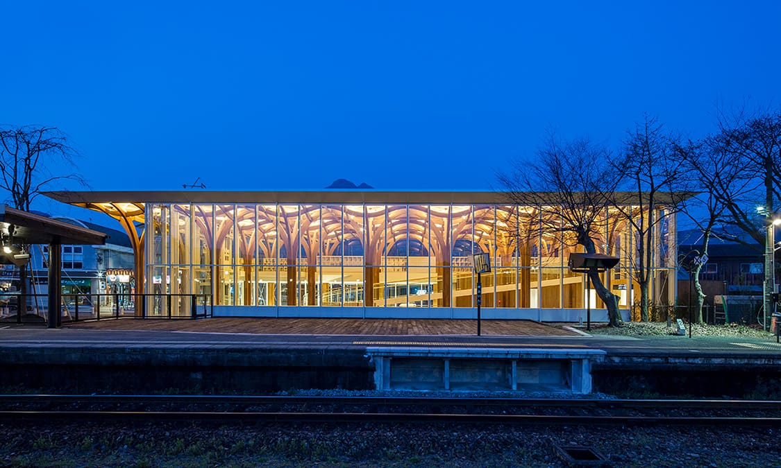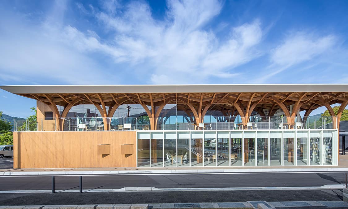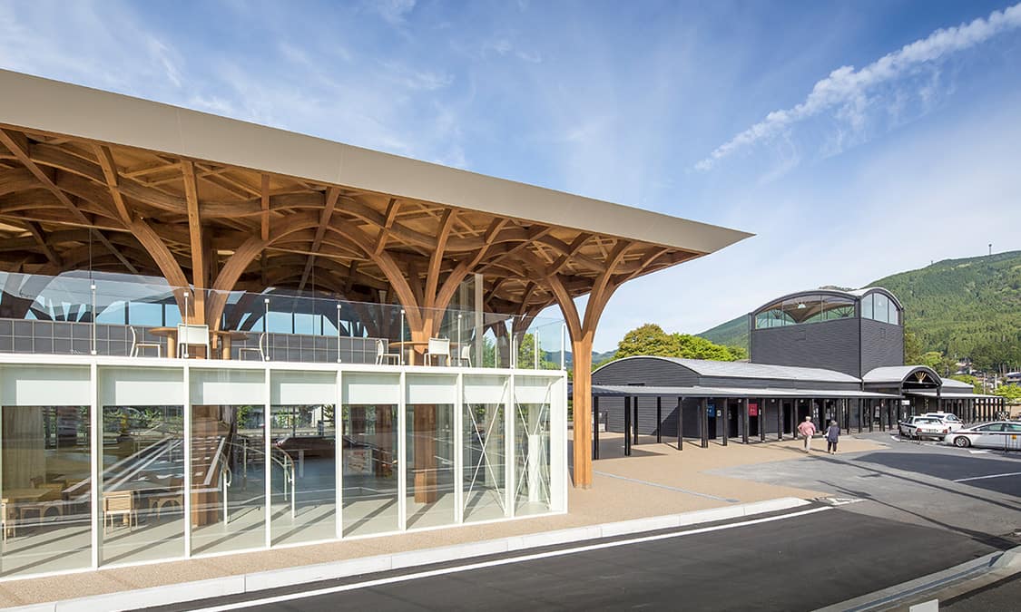 Das Gebäude, das eine fast vollständig verglaste Oberfläche und Y-förmige, dreidimensionale Holzpfeiler aufweist, ist von einer Bauart, die in Yufuin bisher nicht zu finden war. Dennoch fügt es sich auf wundersame Weise nahtlos in das Stadtbild von Yufuin ein.
