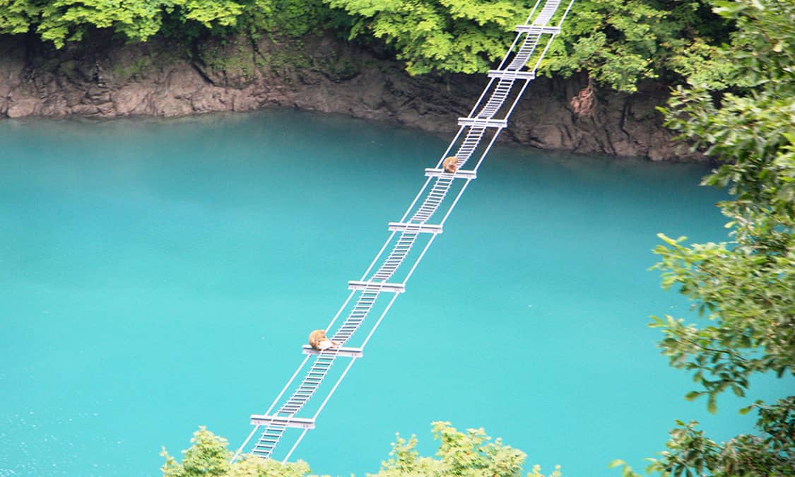 Auf dem Weg zum Bahnhof Kuronagi kommen Sie in den Chubu-Sangaku-Nationalpark, der Ihnen eine noch beeindruckendere Berglandschaft bietet. Die Atobiki-Brücke ist unglaubliche 60 Meter hoch und verläuft über die steilste Schlucht der Strecke – zwischen dem Bahnhof Kuronagi und dem Bahnhof Sasadaira. Man erzählt sich, dass Bergsteiger nach dem Anblick der überwältigenden Höhe der Schlucht zum Rückzug bewegt wurden. Daher kommt auch der Name der Brücke: Atobiki bedeutet so viel wie sich zurückziehen. Das absolute Highlight ist die Landschaft. Die Thermalquellen von Kuronagi sind die Quelle der Thermalquellen von Unazuki und verfügen über das älteste Freiluftbad in der Kuronabe-Schlucht. Die Thermalquellen befinden sich etwa 20 Gehminuten vom Bahnhof Kuronagi entfernt.