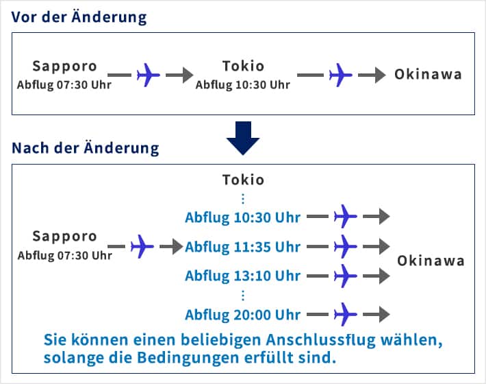 Bei Transitflügen über einen von ANA definierten Anschlussflughafen zwischen Abflugort und Reiseziel wird die gesamte Strecke als ein durchgehender Flugabschnitt gewertet – so haben Sie mehr Auswahl bei reservierbaren Flügen als je zuvor!