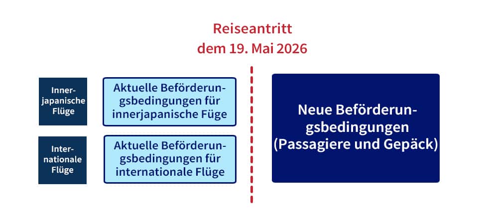 Die für innerjapanische Flüge geltenden Beförderungsbedingungen ändern sich von den am Boarding-Datum geltenden Geschäftsbedingungen zu den zum Reiseantritt geltenden Geschäftsbedingungen.