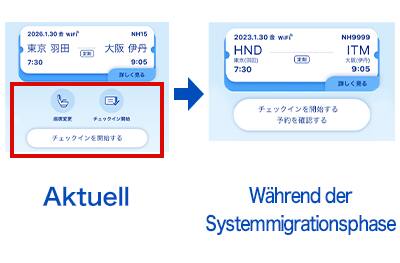 Bei Flügen, die von Flughäfen mit dem alten System aus starten, werden die Schaltflächen „Sitzplatz ändern“, „Check-in stornieren/ändern“ und „Bordkarte drucken“ ab 24 Stunden vor der geplanten Abflugzeit nicht mehr auf dem Hauptbildschirm der ANA-App angezeigt. Stattdessen wird die Schaltfläche „Check-in starten/Reservierung ansehen“ angezeigt.