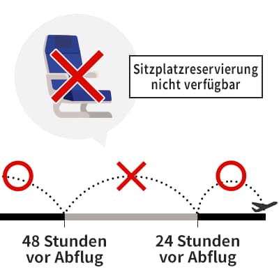 Für Flüge, die von einem Flughafen mit dem alten System starten, können zwischen 48 und 24 Stunden vor der Abflugzeit keine Sitzplatzreservierungen vorgenommen werden. Bei Tarifen, die eine Vorab-Sitzplatzreservierung ermöglichen, muss die Sitzplatzreservierung spätestens 48 Stunden vor der Abflugzeit getätigt werden oder beim Online Check-in oder am Flughafenschalter erfolgen.