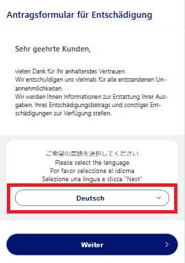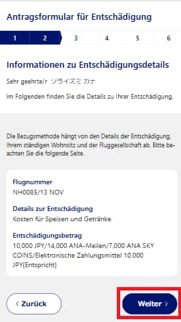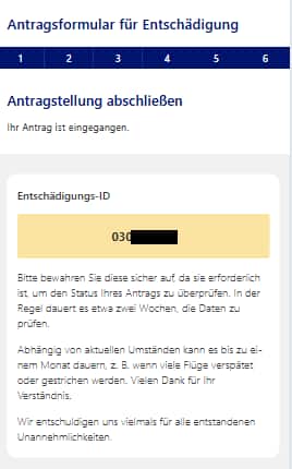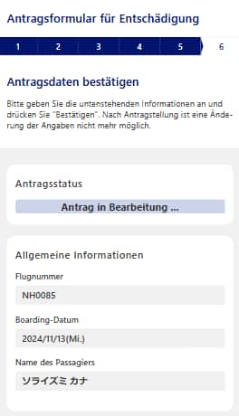 Die Antragstellung ist abgeschlossen. Bitte halten Sie die Nummer Ihres Entschädigungsantrags bereit, da dies bei der Kontaktaufnahme mit ANA usw. benötigt werden könnte.