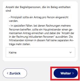 Bitte geben Sie die Anzahl der Begleitpersonen nur an, wenn Sie eine Entschädigung für sie beantragen, z. B. für Unterkunft und Transport.. Bitte lesen Sie den Abschnitt Häufig gestellte Fragen für mehr Informationen über mögliche Fehler bei einem Antrag für mehrere Personen.