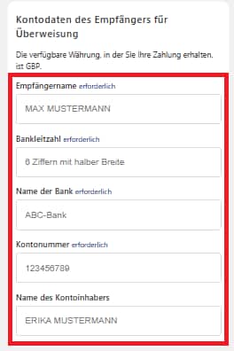 Die erforderlichen Informationen variieren je nachdem, welche der folgenden Zahlungsmethoden Sie wünschen.