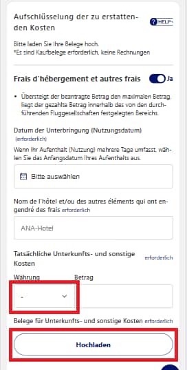 Die Seite zum Hochladen von Belegen wird nur angezeigt, wenn Sie eine Entschädigung für Unterkunftskosten, Transportkosten usw. beantragen. Bitte reichen Sie den Beleg ein und geben Sie die erforderlichen Informationen an.