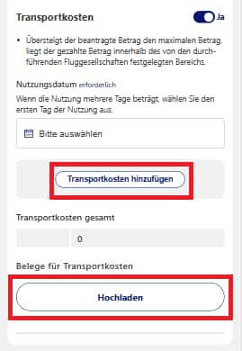 Die Seite zum Hochladen von Belegen wird nur angezeigt, wenn Sie eine Entschädigung für Unterkunftskosten, Transportkosten usw. beantragen. Wenn Sie eine Entschädigung für Reisekosten beantragen, klicken Sie auf „Reisekosten hinzufügen“ und geben Sie die erforderlichen Informationen ein.