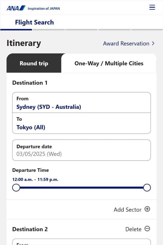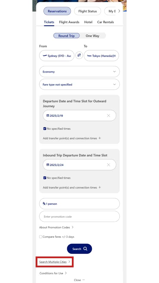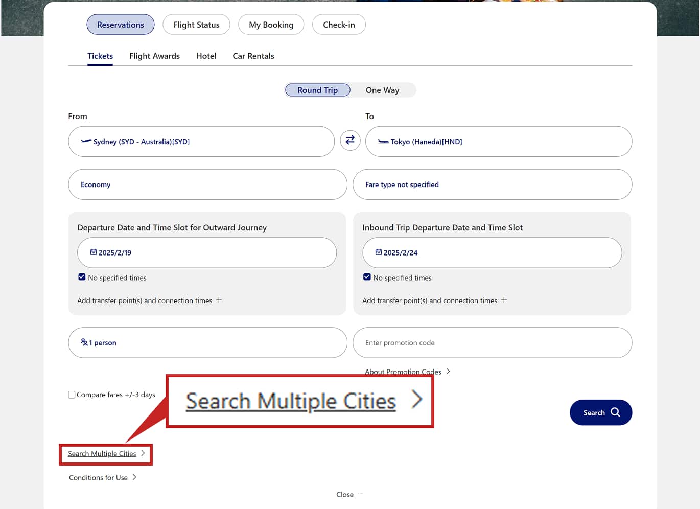 1. Head over to ANA website and click 'Search Multiple Cities'.