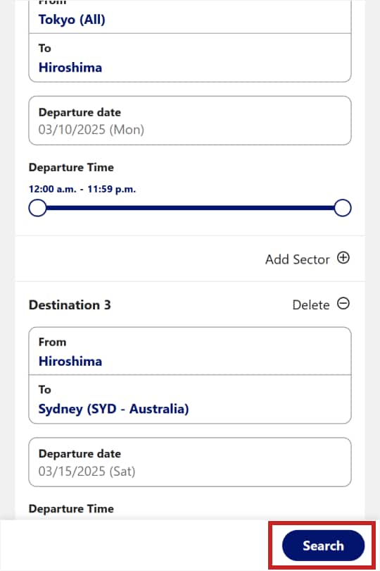 2. Input your travel dates and destinations respectively, ending with your flight home. Check your itinerary, select 'Search'.