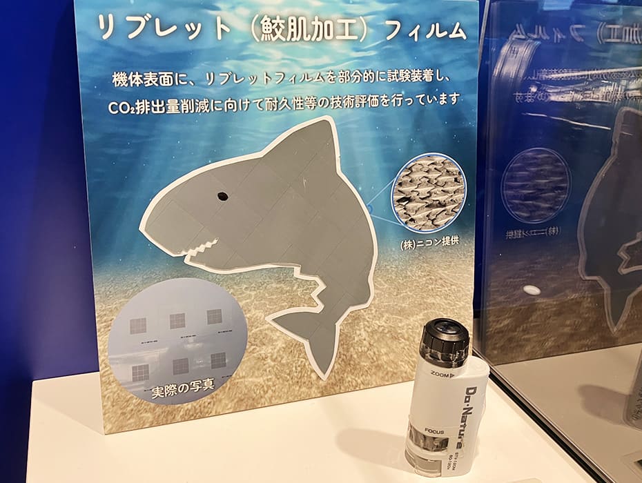 In order to increase the fuel efficiency of its fleet and reduce CO2 emissions from aircraft, ANA has adopted riblet film, which imitates the structure of shark skin, for some of its planes. This film reduces air resistance on the fuselage surface and is expected to help reduce the consumption of fuel by around 250 tons and the emission of CO2 by roughly 800 tons per airplane annually.