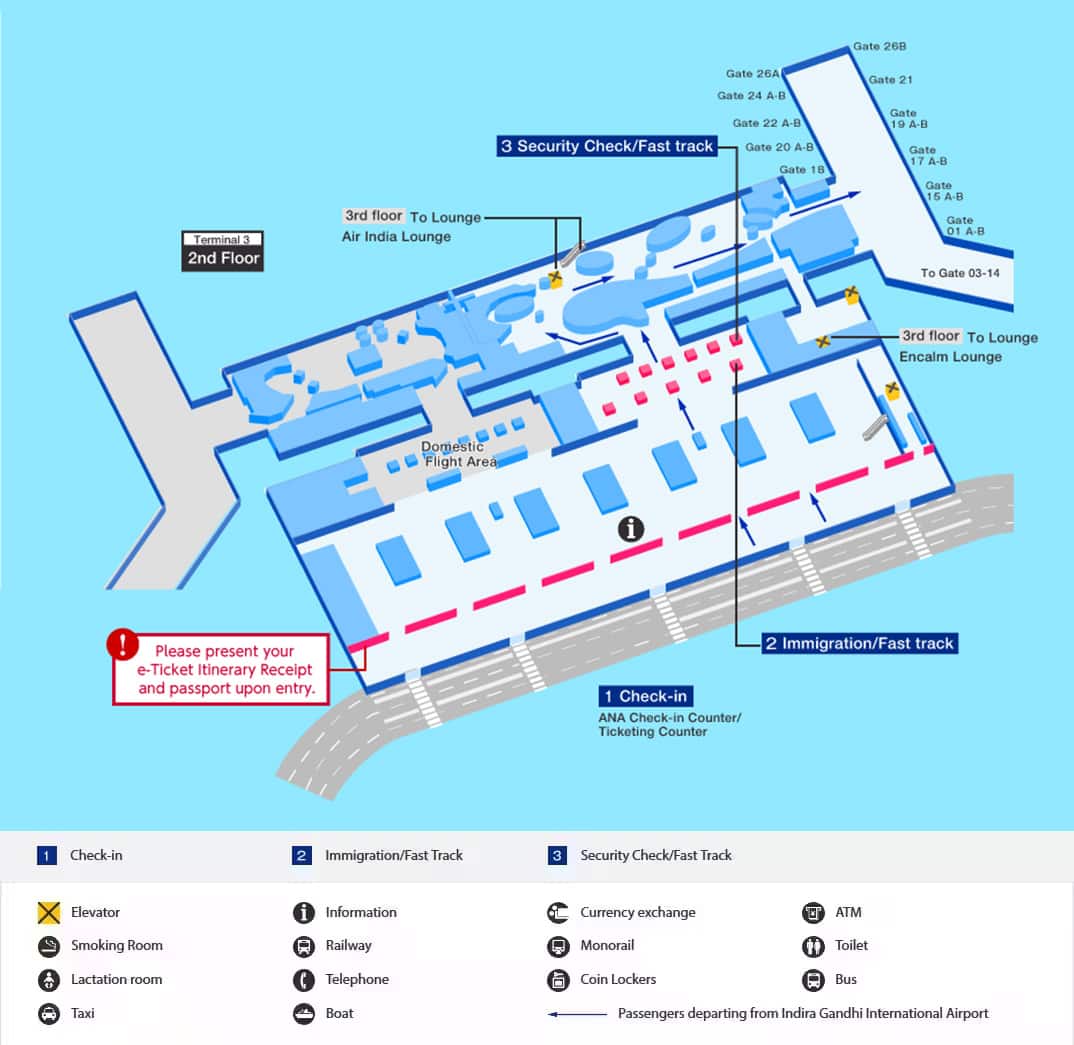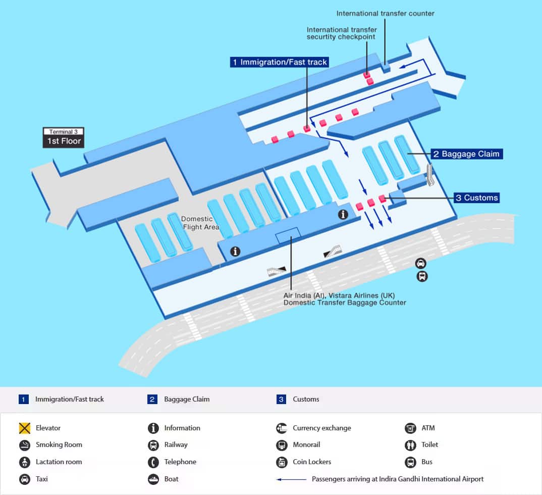 Arrival and departure terminal maps and other information for navigating India's Indira Gandhi International Airport.