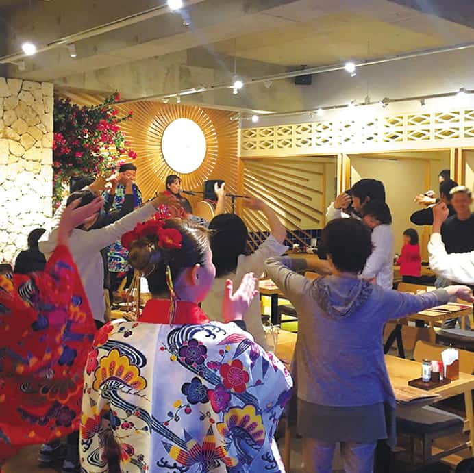 Okinawa Islands are known for emerald-green waters and lush, abundant nature owing to the subtropical climate, but the best part of visiting is meeting the friendly people of the islands. Sip "awamori," a distilled liquor indigenous to Okinawa, and enjoy dancing the "kachashi" traditional festive folk dance to the sounds of the "sanshin" musical instrument as the locals do. Okinawa Kitchen Paikaji Okikokudaimae Store is just the right place to experience such an exquisite local atmosphere.As you enter the bar garnished with eye-catching traditional red roof tiles, staff dressed in Okinawan costumes will greet you.