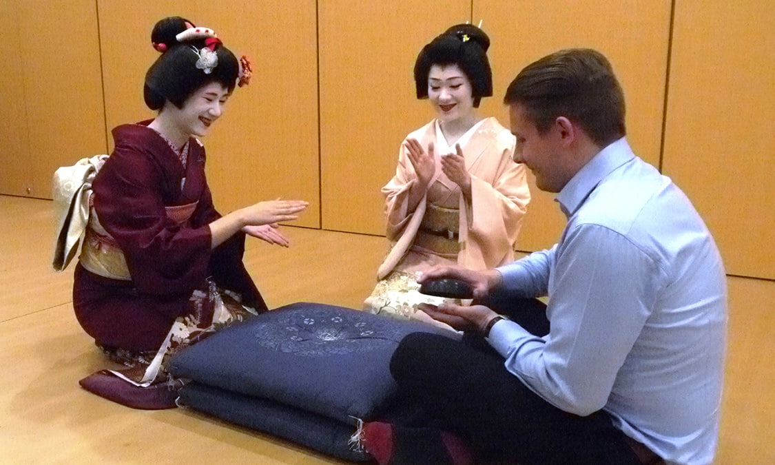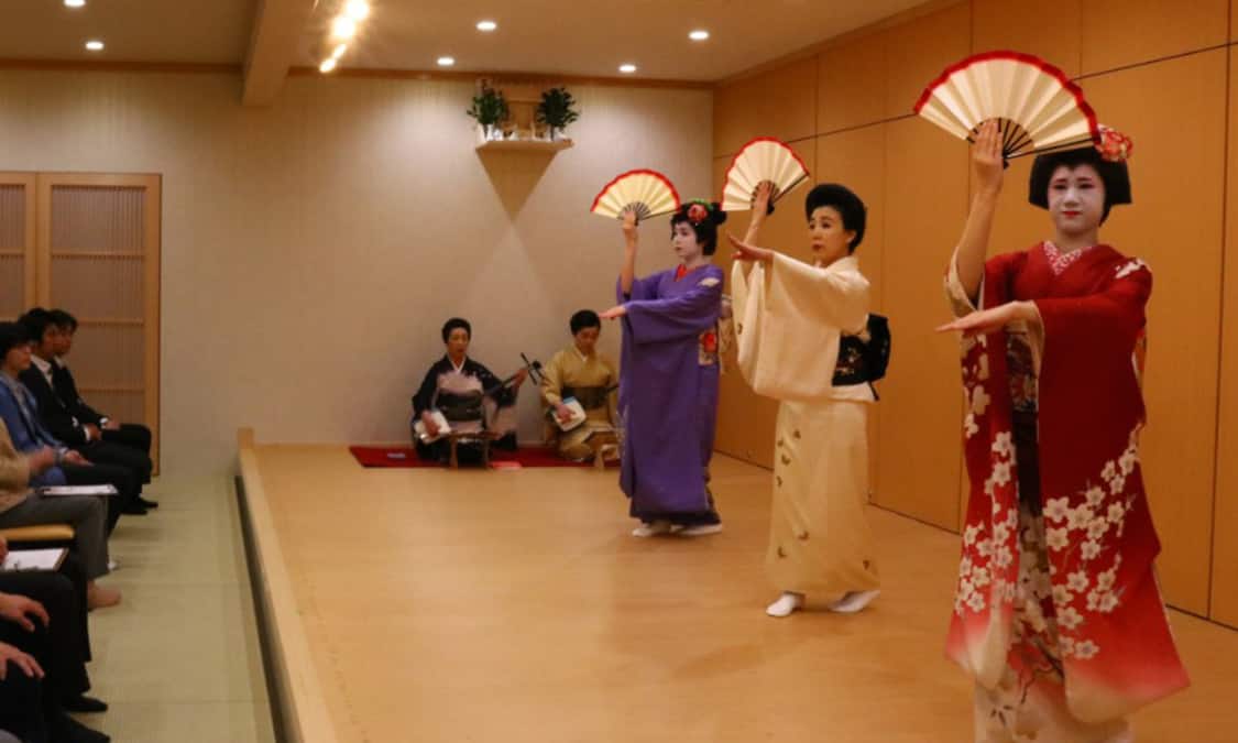 After having enjoyed watching the performance by Hakata Geigi (geisha), the Fukuoka Folk Dancer "Shiki no kai, " Tsukushi-Mai, Hakata Koma, etc., there's time for a simple ozashiki experience, including question time and commemorative photos with the geigi.