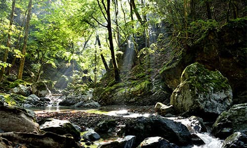 Deep in Kawakami Village, in the Sannoko district where the headwaters of the Yoshino River lie, is a forest untouched for over 500 years. The Togasawara, or Japanese Douglas fir, native to this area is a species of conifer in the pine family that was once widely found in the Northern Hemisphere several million years ago, but is mostly extinct due to climate change and other factors. Today, the species endemic to Japan can only be seen here in addition to the central southern Kii Peninsula and a limited part of eastern Kochi Prefecture, and is called a "living fossil." The Sannoko River Togasawara Primeval Forest was designated as a natural monument by the Japanese government in 1929.