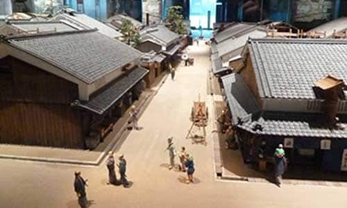 The 9th floor exhibits the medieval and modern history of Osaka. Senba, the commercial heart of Osaka in the mid-18th century, is reproduced in 1/20 scale, featuring such famous establishments as Chigusaya, one of the leading money changers in Osaka, and Kaitokudo, a learning institution for the townspeople. On the streets are the master and mistress of a merchant house and apprentices and boatmen of the kitamae-bune (cargo ships that sailed the Sea of Japan during the Edo Period (1603-1868)) coming and going, vividly depicting the lively atmosphere of the townspeople of Osaka.