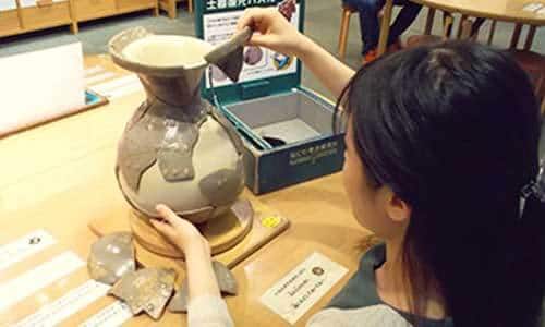 The 10th to 7th floors feature the museum's permanent exhibition introducing the history of Osaka from ancient to modern times. The 8th floor is the Excavating the Past floor, the Naniwa Archaeological Resource Centre. Learn how actual research is conducted and observe the building remains at the reproduction of an excavation site while solving a worksheet. You can observe the seeds of plants unearthed from the ruins under a microscope, as well as see earthenware and stone wares from various periods up close. You can also experience restoring unearthed relics by assembling a three-dimensional puzzle of earthenware. This is a great facility to familiarize yourself with archaeology through sight and touch.