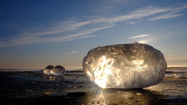 Jewelry Ice is the spectacle formed by ice pieces from the surface of Tokachi River washed up on the shore after being brought to the Pacific Ocean. It shines under the bright sun.