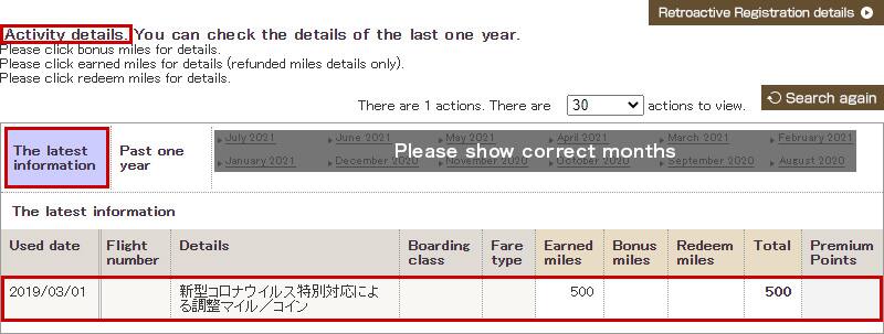 For results after one month, please check "Past one year". You can also check your mileage by clicking "Mileage balance details" under "Mileage expiring within the next three months."