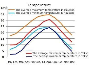 | Month | The average maximum temperature in Tokyo | The average mimimum temperature in Tokyo | The average maximum temperature in Houston | The average mimimum temperature in Houston |