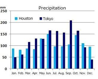 The average precipitation in Tokyo and Houston