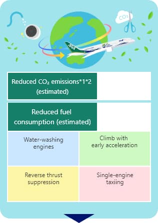 “Reduced CO₂ emissions” for early acceleration, reverse thrust suppression, and single-engine taxiing are calculated based on the estimated reduced fuel consumption obtained from flight data.
