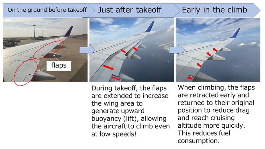 Airplane wings have flaps that extend and retract to change the size of the wing area. During takeoff, the flaps are extended to widen the wing area, allowing the aircraft to climb at lower speeds with lift. While flying with the wing area extended, air resistance also increases, making it difficult to increase the speed. Also, the longer the flaps are kept extended, the less fuel efficient the aircraft will be. The measure to reduce aerodynamic drag by retracting the flaps early after takeoff (around 300 m altitude) to reach the cruising altitude (around 10,000 m) more efficiently, is called "Normal Climb" and is linked to fuel savings and reduced CO₂ emissions.