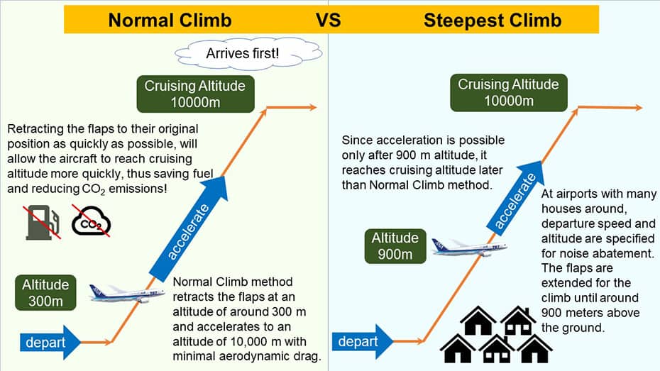 Conversely, there is also the "Steepest Climb" method, in which the aircraft climbs to a certain altitude (usually around 900 m) with the flaps extended after takeoff. At some airports, the altitude and speed after takeoff are specified to reduce noise, and at such airports, the Steepest Climb method is performed by keeping the flaps extended to an altitude of around 900m. Although this method is effective in reducing noise, it also increases the time of aerodynamic drag compared to the Normal Climb, and as a result, more fuel is consumed in the climb. It is more fuel efficient to retract the flaps and return them to their original position as quickly as possible.