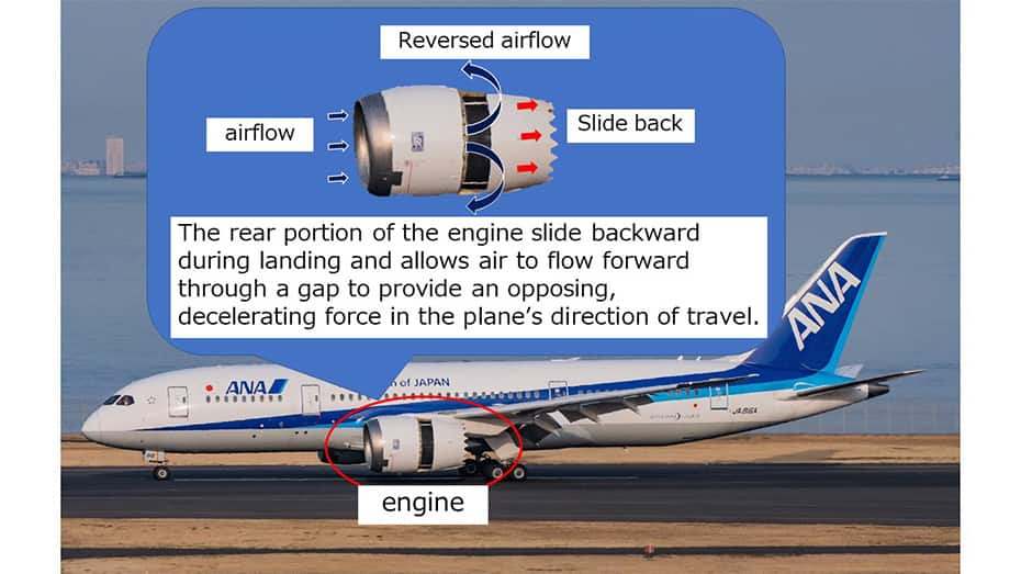 After landing, airplanes are slowed down using thrust reversers and brakes. When reverse thrust is active, it changes the direction of airflow emitted from the engine to help slow the aircraft down quickly.