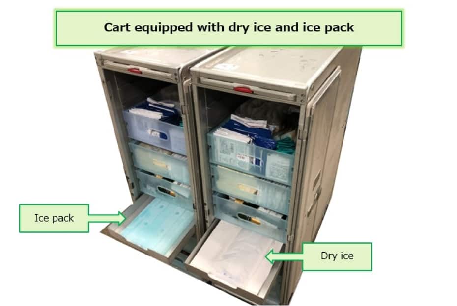 In addition, the repeated use of ice pack will result in an annual reduction of about 30 tons of dry ice packaging materials and matting placed under the dry ice, and is expected to reduce total costs by approximately 200 million yen per year (approximately 80% reduction) compared to dry ice. Also, by switching to ice pack, the catering staffs and cabin attendants can concentrate on their work without worrying about being exposed to dry ice.