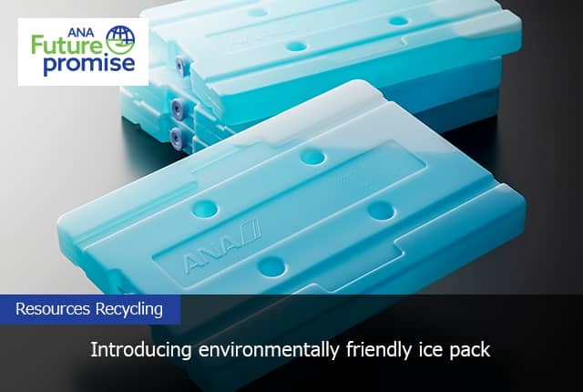 ANA Group has been using dry ice to keep in-flight meals and beverages served to customers cold for quality control purposes. While dry ice has a very high cooling capacity and is disposable and easy to operate, it has the problem of CO2 emissions due to sublimation and increasing cost. Also, due to the extremely low temperature of -78.5 degrees Celsius, we had to be very careful when handling it. By switching to reusable ice pack and reducing the annual use of dry ice by 1,700 tons (FY 2019 actual), we can reduce the 1,700 tons of CO2* emissions that occurs from the sublimation of dry ice.