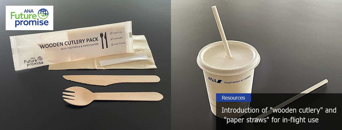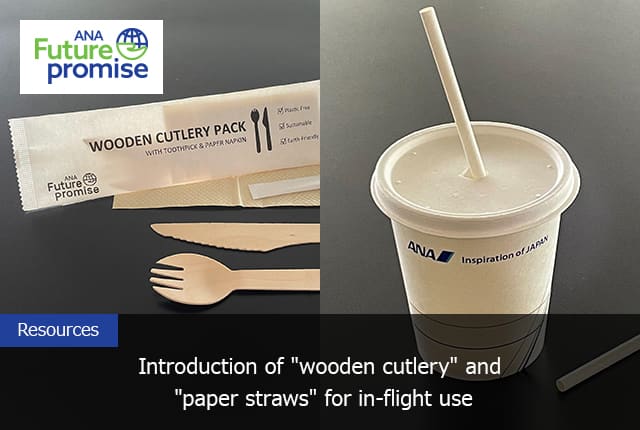 As part of ANA Group's initiatives to reduce the use of disposable plastics, we will change the cutlery provided to customers on board to wooden cutlery and straws to paper straws.