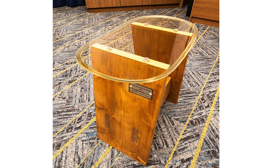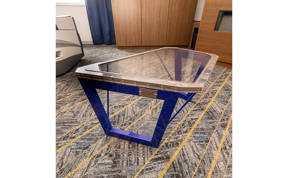 Each upcycled item has a laser-engraved plate with the aircraft number of the plane in which it was installed. We hope that the upcycled items will bring back memories of the many passengers who have flown in and out of Japan. A stool made from the cabin window and a vertical tail fin ornament that is a scaled-down version of the actual aircraft are on display. They are both made from Boeing 787 cabin windows and the Boeing 787 has windows that are thicker than those of other models to sufficiently withstand pressurization. We would like you to feel the thickness of those windows. The cockpit window of a Boeing 737 consists of a total of six panes, and the one upcycled into the side table this time is the rightmost window viewed from inside the cockpit. The legs of the table are painted in Triton blue, the color used on ANA aircraft, which is another particular feature of the table. Finally, motor fans, a component of air conditioning units, are anodized during production to prevent corrosion and increase surface hardness so that the aluminum material does not deteriorate due to corrosive elements in the air. When upcycling this motor fan into a clock, we kept the beautiful yellow-green color of the anodized material and this is another interesting point to look at.