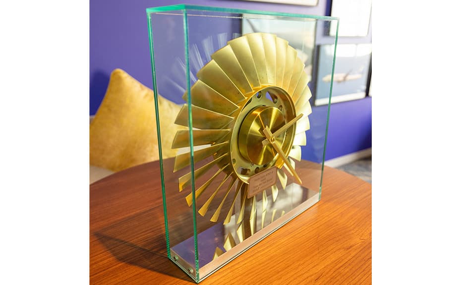 Two upcycled items can also be found in the showcase in the room. One of them is a clock made by a mechanic from discarded motor fans that are part of an aircraft's air conditioning system, and the other is an ornament made from discarded cabin windows from a Boeing 787 that resembles an aircraft's tail fin.