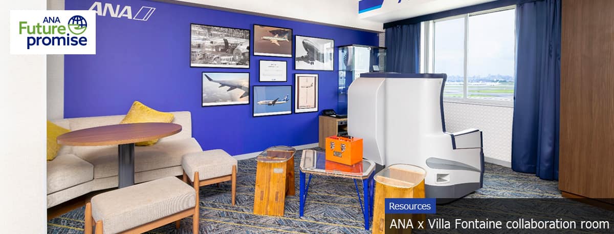The ANA Group has been promoting upcycling initiatives to reduce resource waste by transforming waste products generated during the replacement of aircraft parts into new items. Upcycled items such as tables, stools, and ornaments handmade by ANA mechanics from discarded items have been adopted in the "ANA ROOM," a collaboration room between ANA and Villa Fontaine.