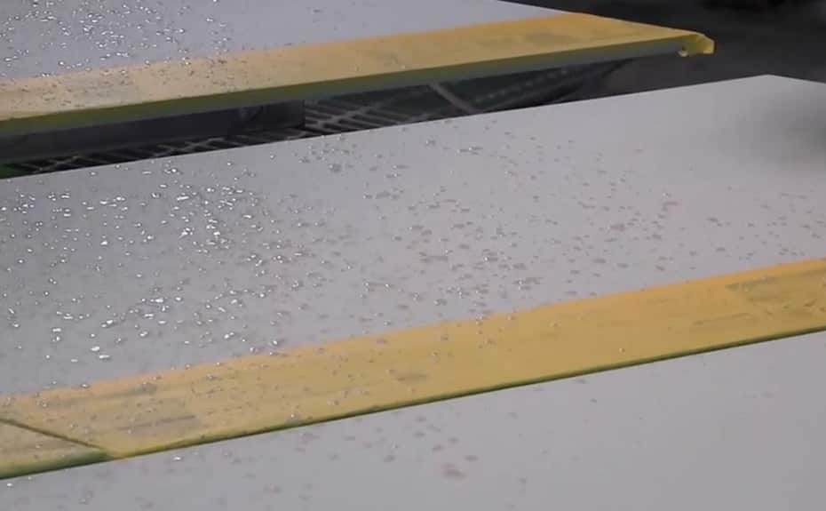Approximately 20 kg of discarded tableware was ground in a mill and blended into a glaze, which was then sprayed onto ceramic panels. These panels were fired in a kiln to produce colors and textures with depth. The finished panels were installed on a large wall, approximately 3 meters high and 22 meters long*1, at the entrance facade of the premium area.