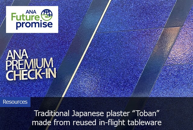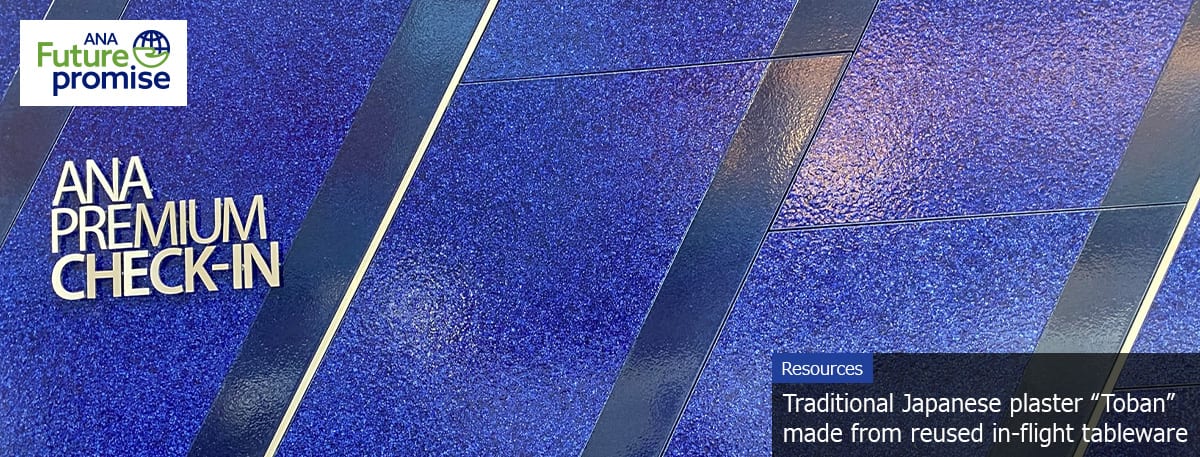 The premium member priority check-in counter for domestic flights at Haneda Airport has been renovated, and Traditional Japanese plaster "Toban" (ceramic panels) made from recycled in-flight tableware were used for the facade of the facility that welcomes customers.